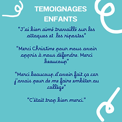 Quand on se fait embêter on ne sait pas toujours quoi dire ou faire.... Ce atelier apprend aux futurs collégiens à trouver les bons mots et à se sentir plus forts dans les relations. 3 mercredis de suite, de 9h à 10h, en petit groupe de maximum 6 enfants. NB: En inscrivant votre enfant, merci de vous assurer que toutes les conditions suivantes sont remplies - Votre enfant est en CM2 - Votre enfant est d'accord pour suivre cet atelier - Votre enfant ne se trouve pas dans une situation de harcèlement installée (le cas échéant, un accompagnement individuel est nécéssaire) - Vous disposez d'une très bonne connexion internet pour la visio - Votre enfant pourra s'isoler sans être dérangé pendant la durée des ateliers et à l'abri de toutes les oreilles de la maison (il doit pouvoir se sentir confiant pour exprimer tout ce qu'il veut )